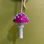 Deep purple felt cap with blue and crystal beads. Grey gills and stem.