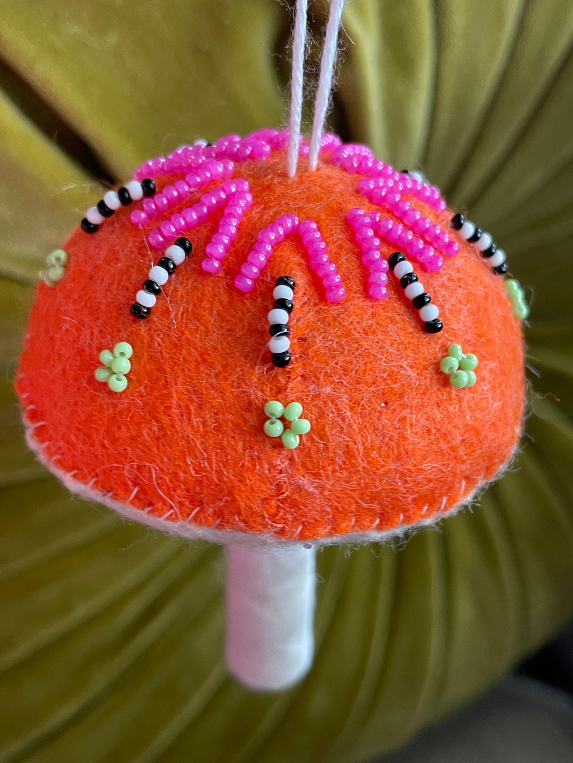Orange felt cap with pink, black, white, and green beads.