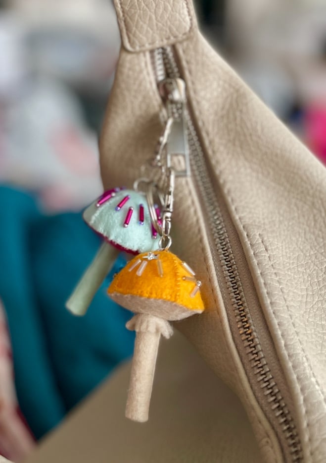 80-100% felt, glass beads, sequins, polyfil. Silver-colored key ring and clasp.
