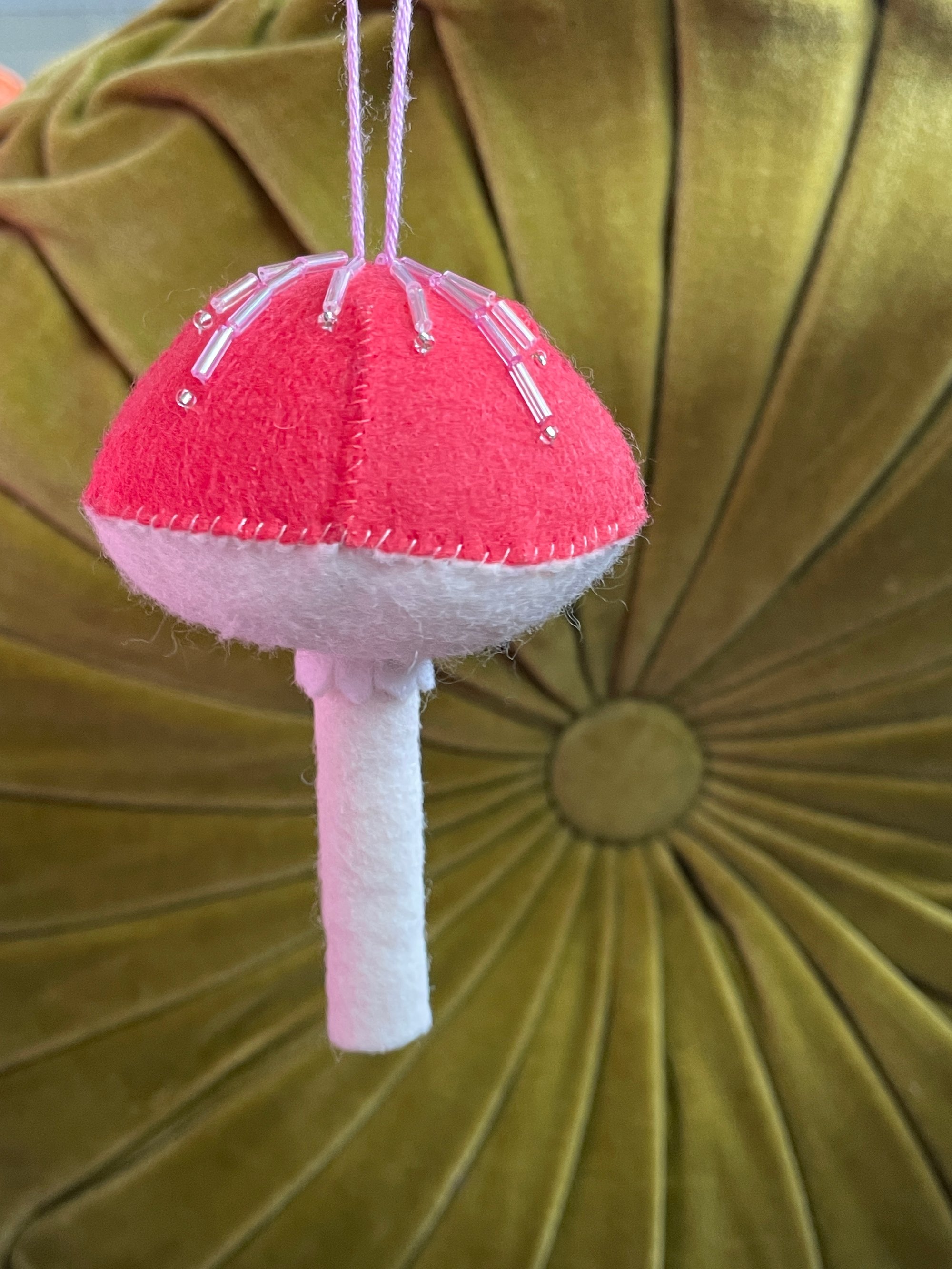 Berry pink felt cap with light pink bugle beads.