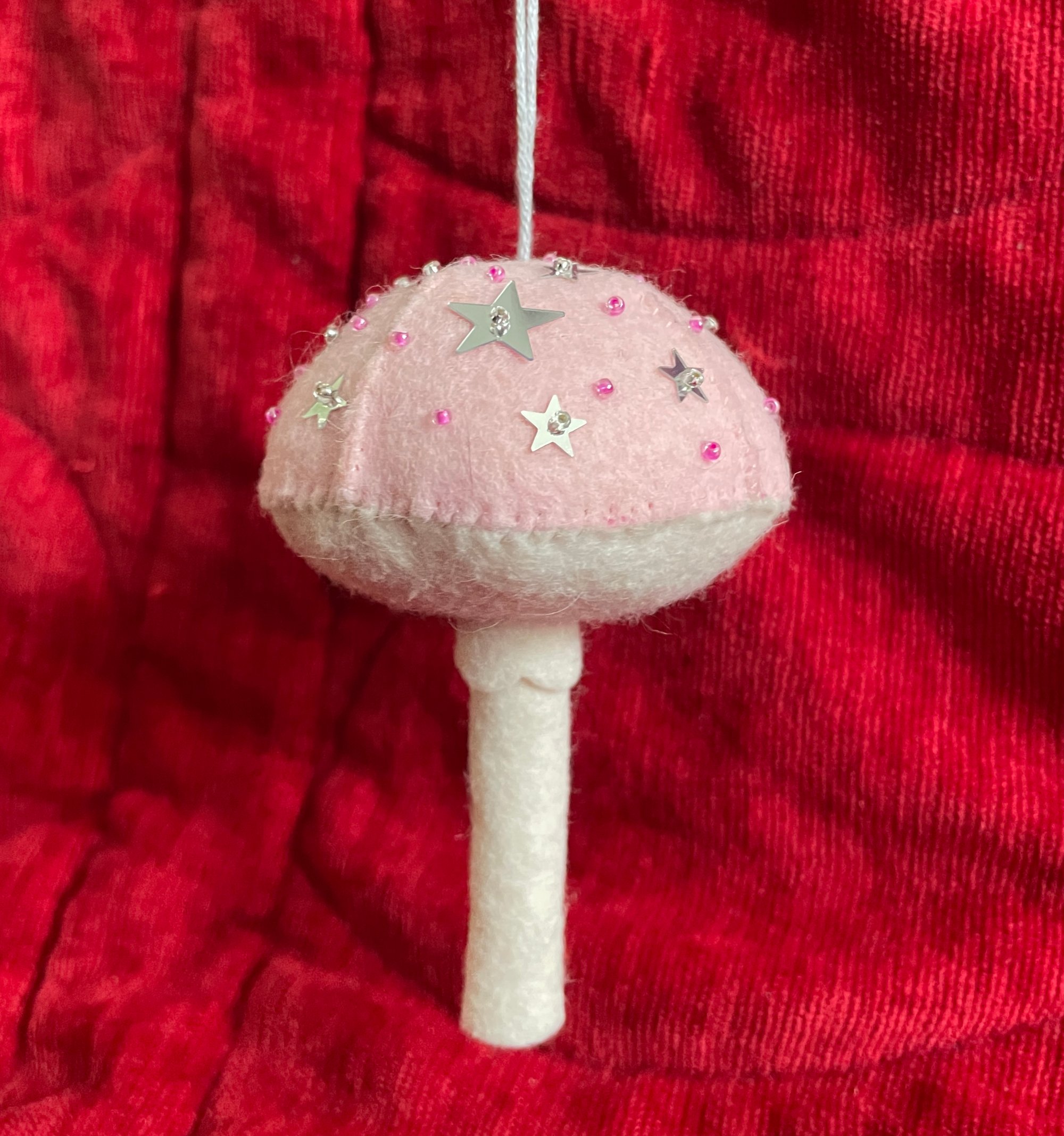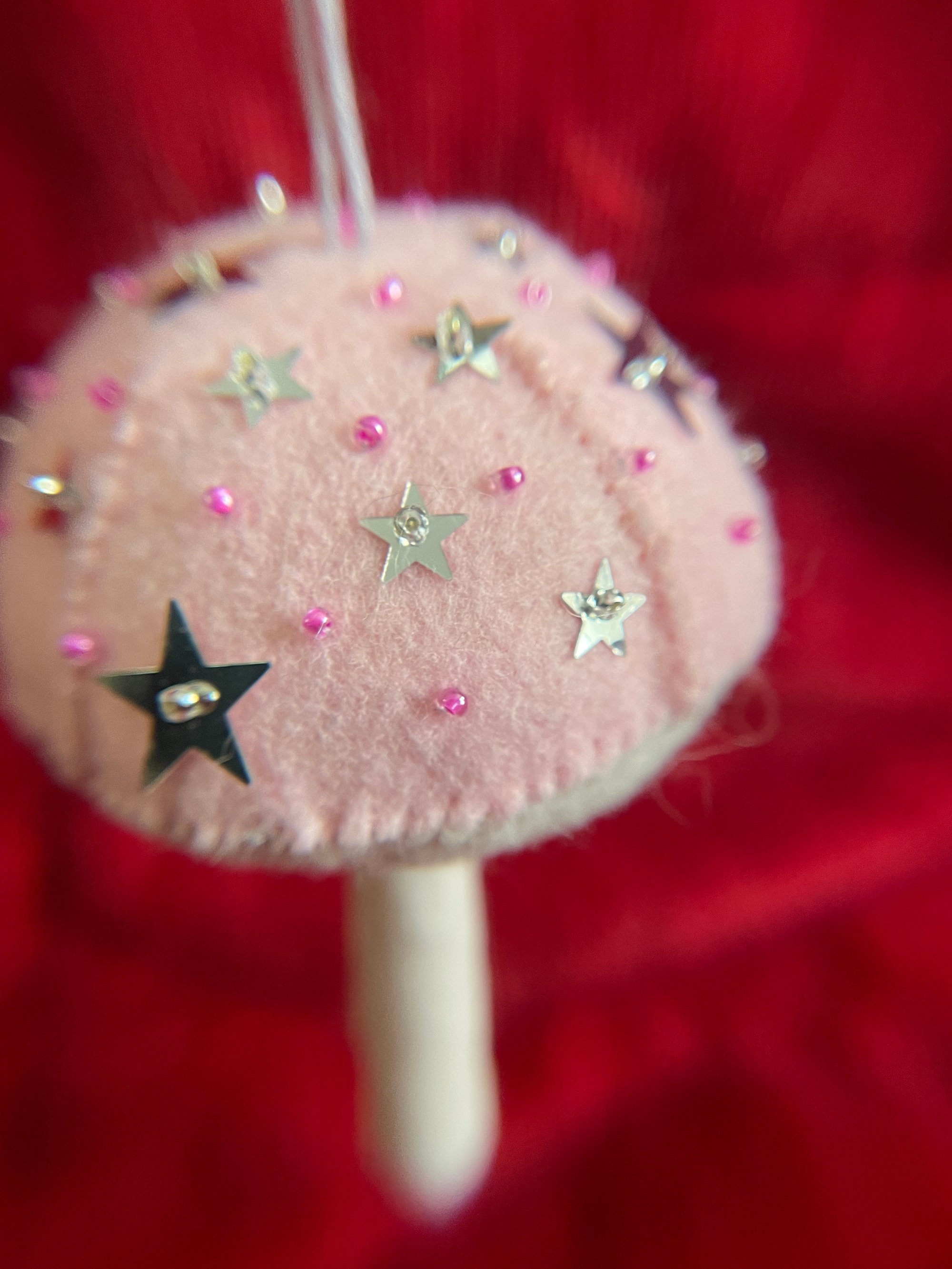 Pale pink felt cap with pink-lined beads and silver stars.