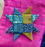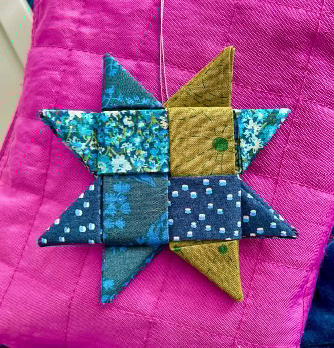 Sawtooth Star is a popular design seen in modern and historical quilts. These ornaments form the distinctive shape by using folded fabric. Perfect for the quilter in your life, or anyone who enjoys bold and cheerful colors.