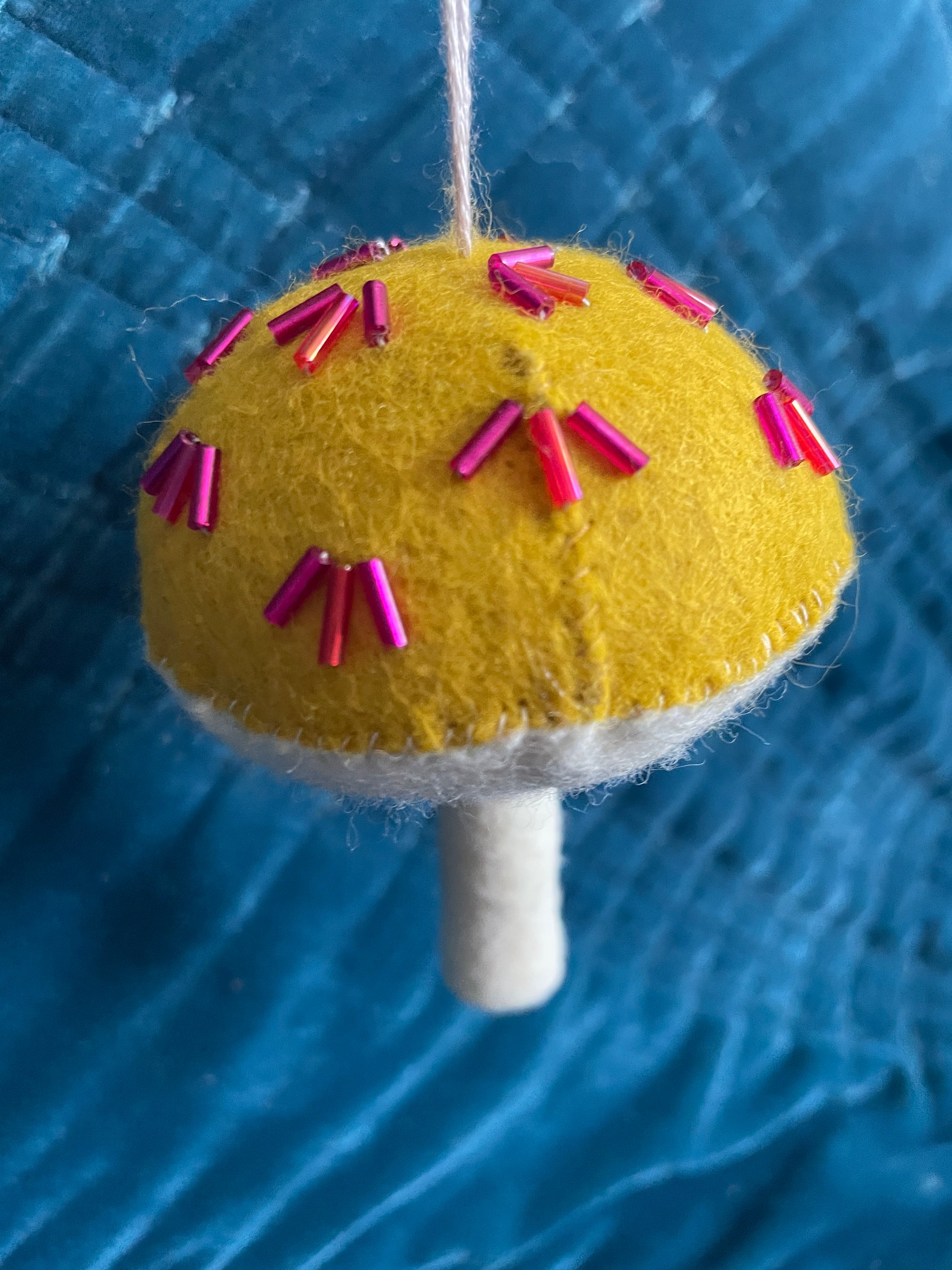 Mustard yellow felt cap with various shades of pink bugle beads.