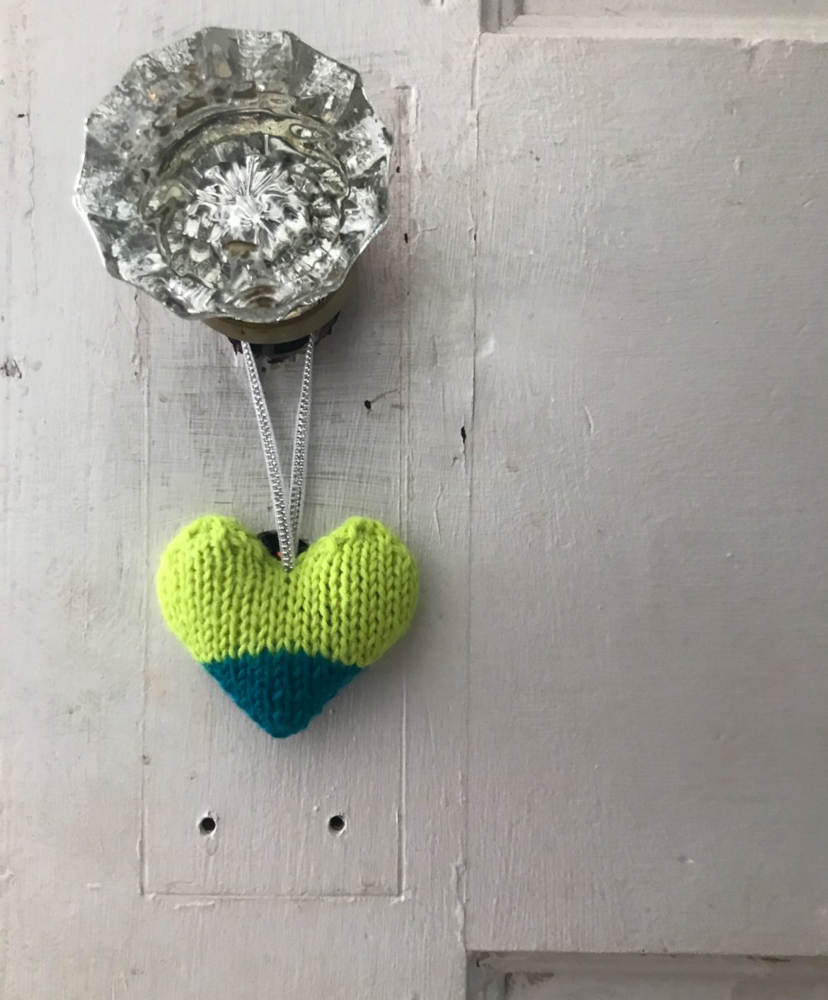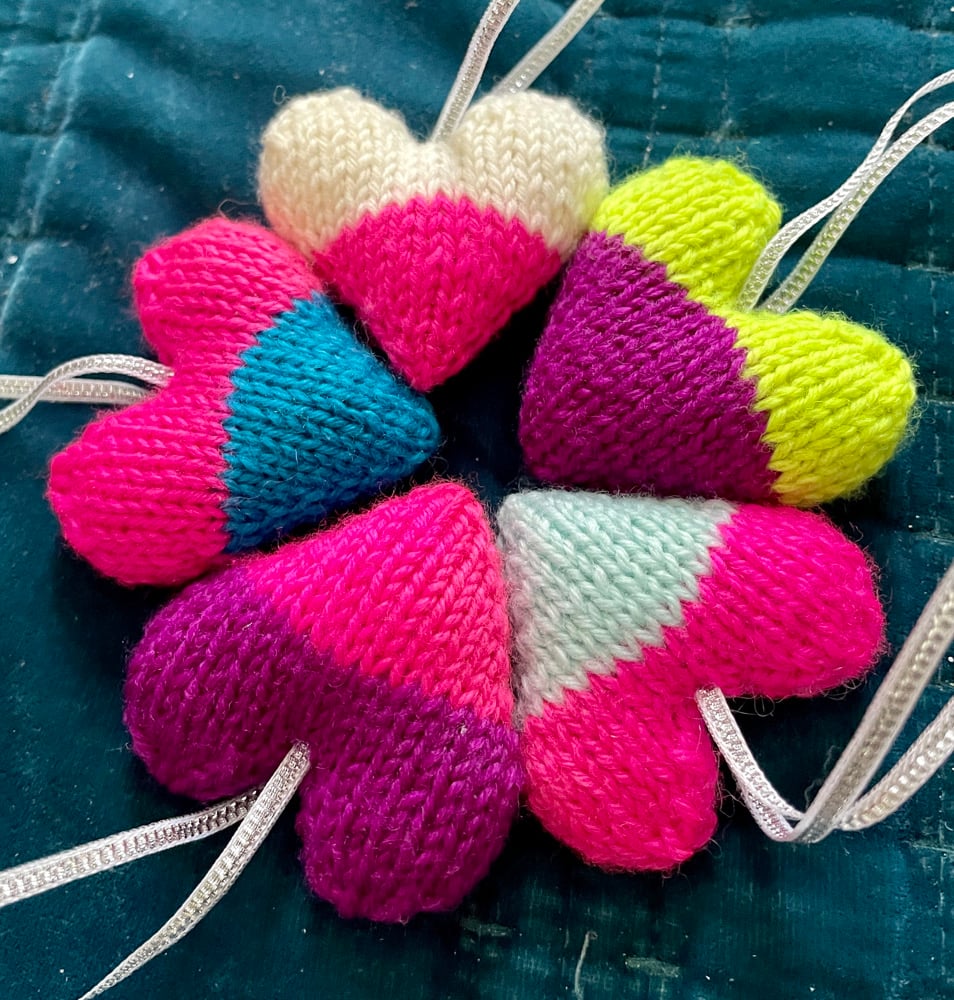 Hand-knit heart ornaments with ribbon or yarn for hanging. Heart itself is approximately 2" x 1.5".